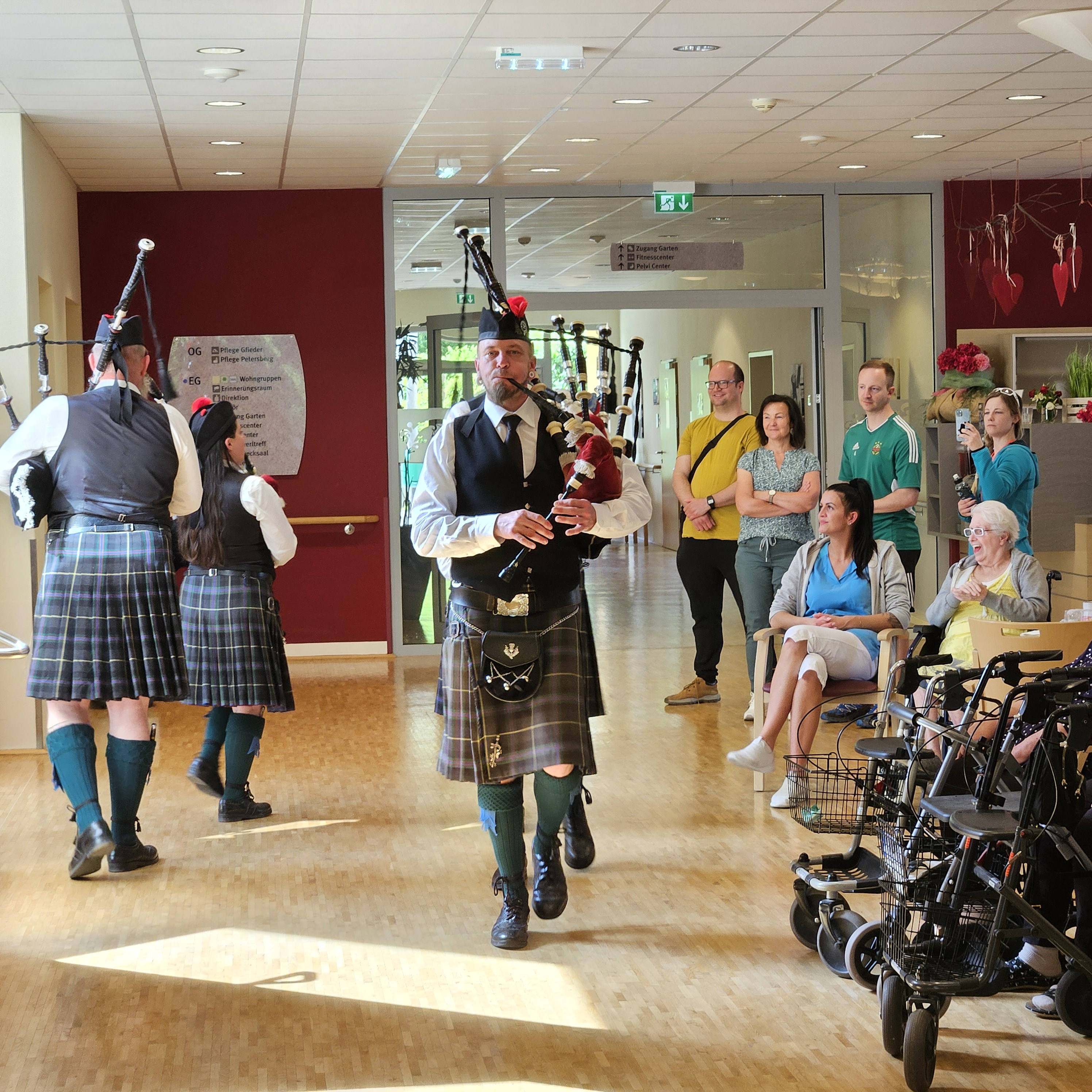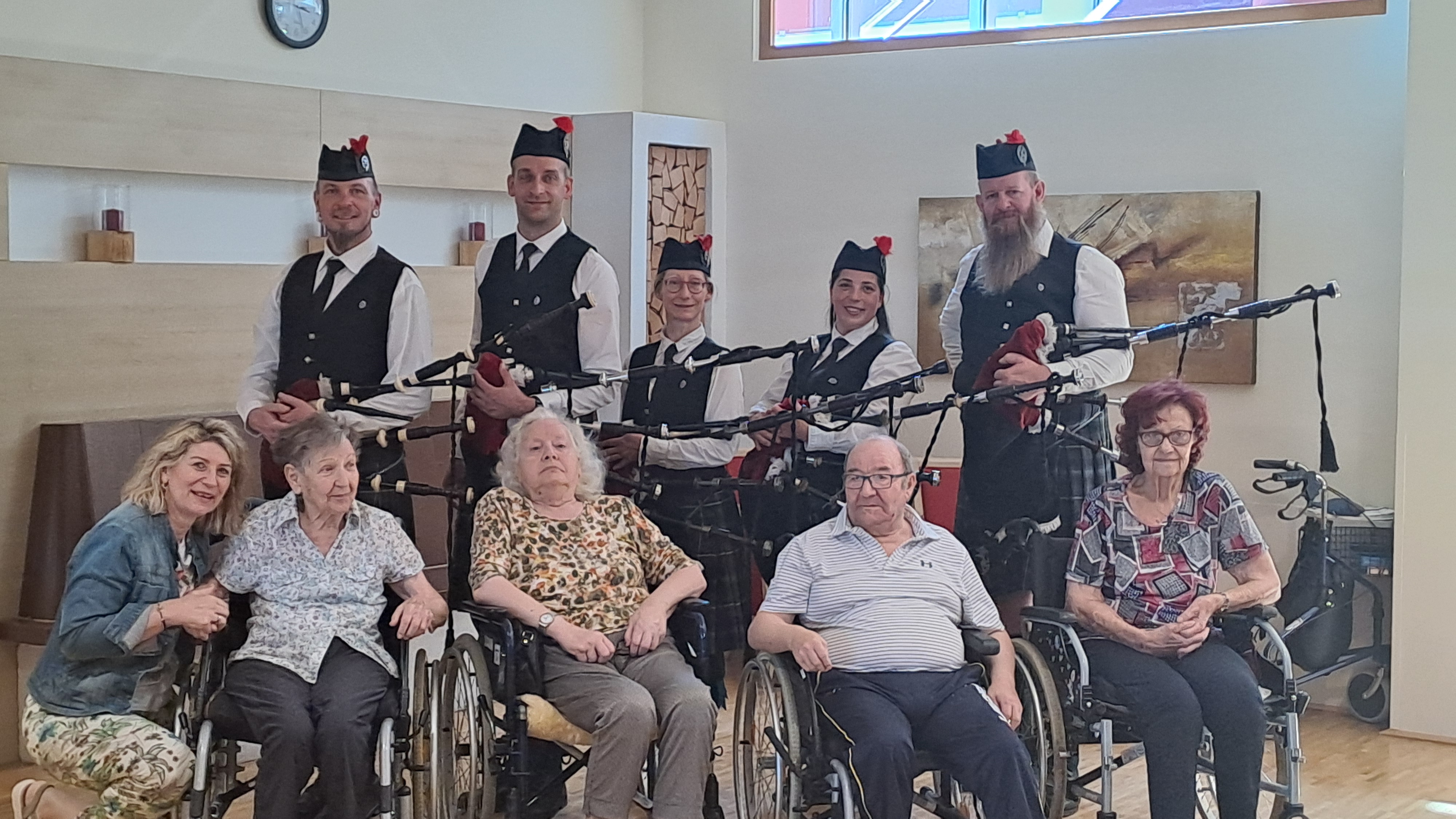 Im SeneCura Sozialzentrum Ternitz gab es heuer zum Muttertag etwas ganz Besonderes, denn die Dudelsackgruppe „Black Smith Pipers“ besuchte das Haus und spielte ein tolles Muttertagskonzert für die Bewohner:innen. Die Seniorinnen und Senioren waren ganz begeistert von den besonderen Klängen der Dudelsäcke und schunkelten zum ein oder anderen Lied fleißig mit.