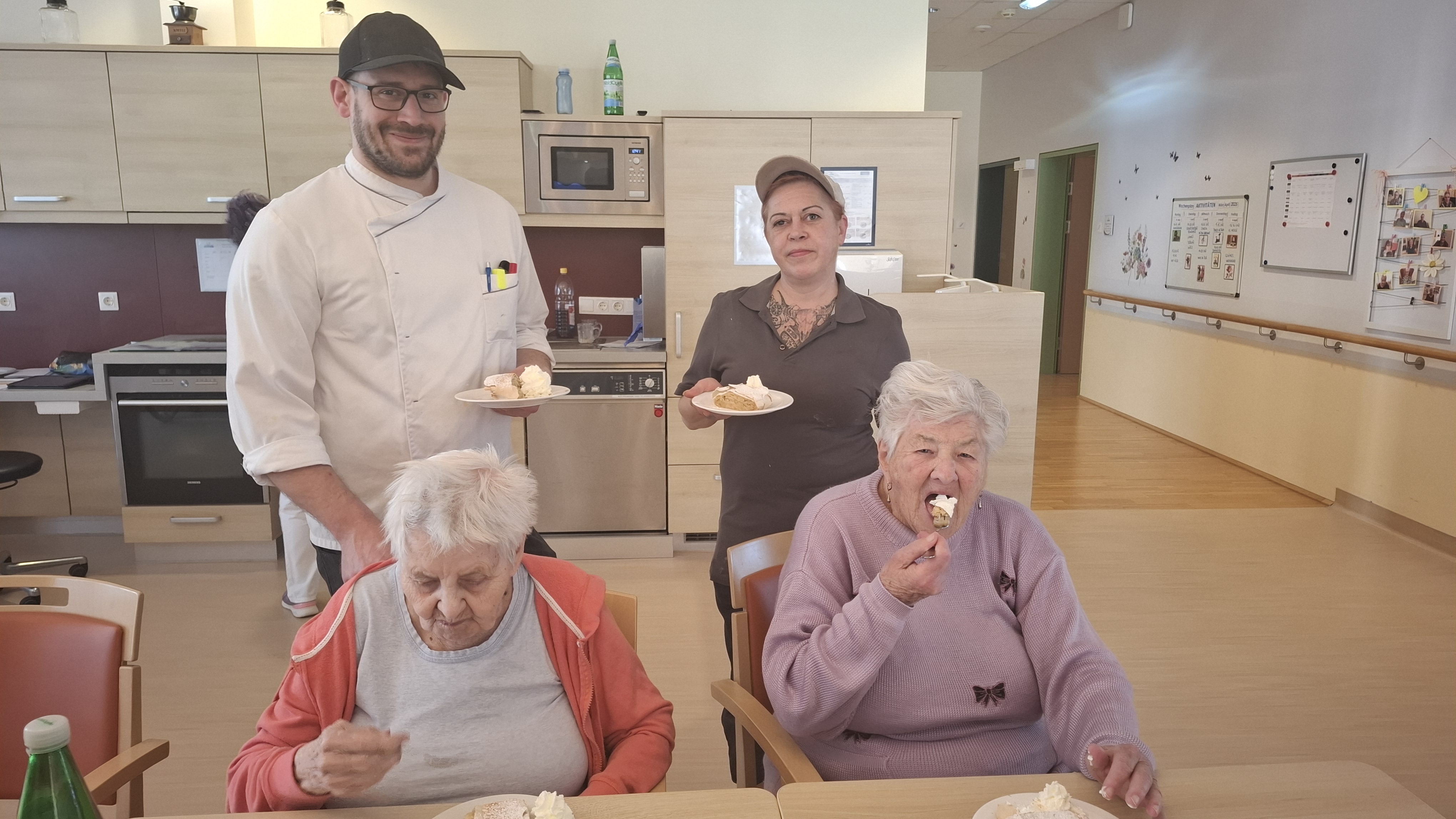 Im SeneCura Sozialzentrum Ternitz wollten die Bewohner:innen kürzlich gemeinsam Apfelstrudel backen. Eifrig schälten und schnibbelten die Seniorinnen sowie Senioren die frischen Äpfel. Dabei plauderten die Bäcker:innen über frühere Zeiten und alle konnten sich lebhaft daran erinnern, wie die Fruchtstrudel zu Hause gemeinsam mit der Mama oder der Oma zubereitet wurden. Verfeinert wurden die geschnittenen Äpfel mit etwas Zucker, Zimt, Vanillezucker sowie Nüssen, die danach auf dem Strudelteig verteilt wurden. Auch das Einrollen übernahmen die fleißigen Helfer:innen und zum Schluss wurden alle Strudel mit Ei bestrichen und ins Backrohr gegeben. Schon nach kurzer Zeit verbreitete sich der köstliche Duft der goldbraun gebackenen Köstlichkeiten im ganzen Haus und die Vorfreude auf die besondere Jause war riesengroß. Nach der Kostprobe waren sich die Bewohner:innen schnell einig, dass dies der beste Apfelstrudel seit Langem war.